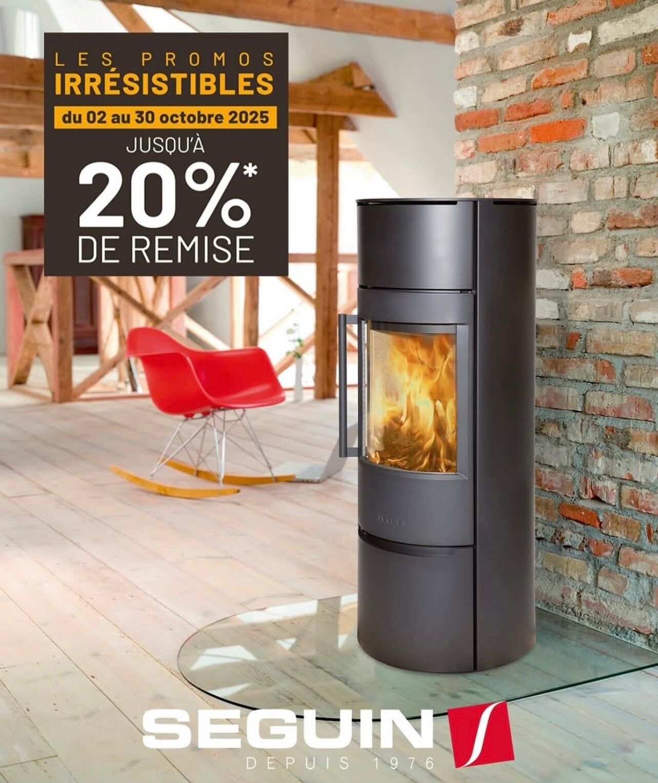 Du 2 au 30 octobre 2025, profitez de jusqu'à -20% de remise sur une sélection de poêles et cheminées SEGUIN